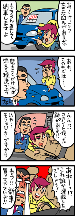 中古車を買いに販売店へ行きました。すると僕が見た車は結構、 細かいキズやヤレなども目立っていました。店員に「全部直してくれたら買うよ」と交渉したところ、「中古車なのでそれは難しい」との返答。