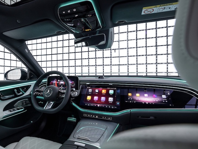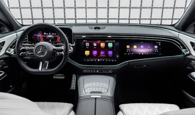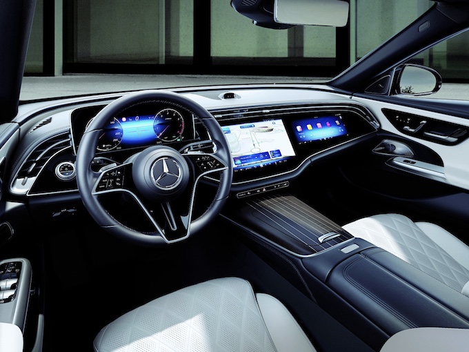 ▲6代目Eクラスワゴンの運転席まわり。写真はMBUX スーパースクリーン装着車