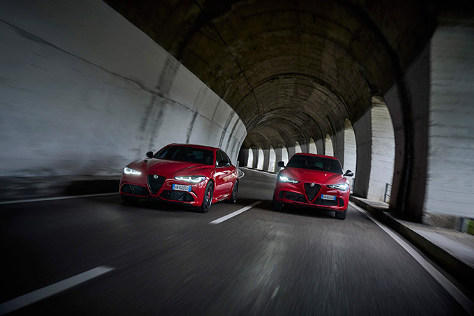 ▲クアドリフォリオのジュリア(左)とステルヴィオ(右)。本格スポーツな走りを楽しめる!白地に緑の四つ葉のクローバーが描かれた「クアドリフォリオ」のエンブレムは、およそ100年前からアルファロメオを国際レースで勝利に導いてきたお守りであり、ハイパフォーマンスカーの証です。