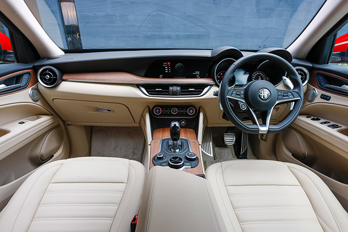 ▲クリーンかつ上質な印象を受けるステルヴィオの内装そして何よりシャープなハンドリングで、スポーツカーのように走れる走行性能はこのクラスでは随一。